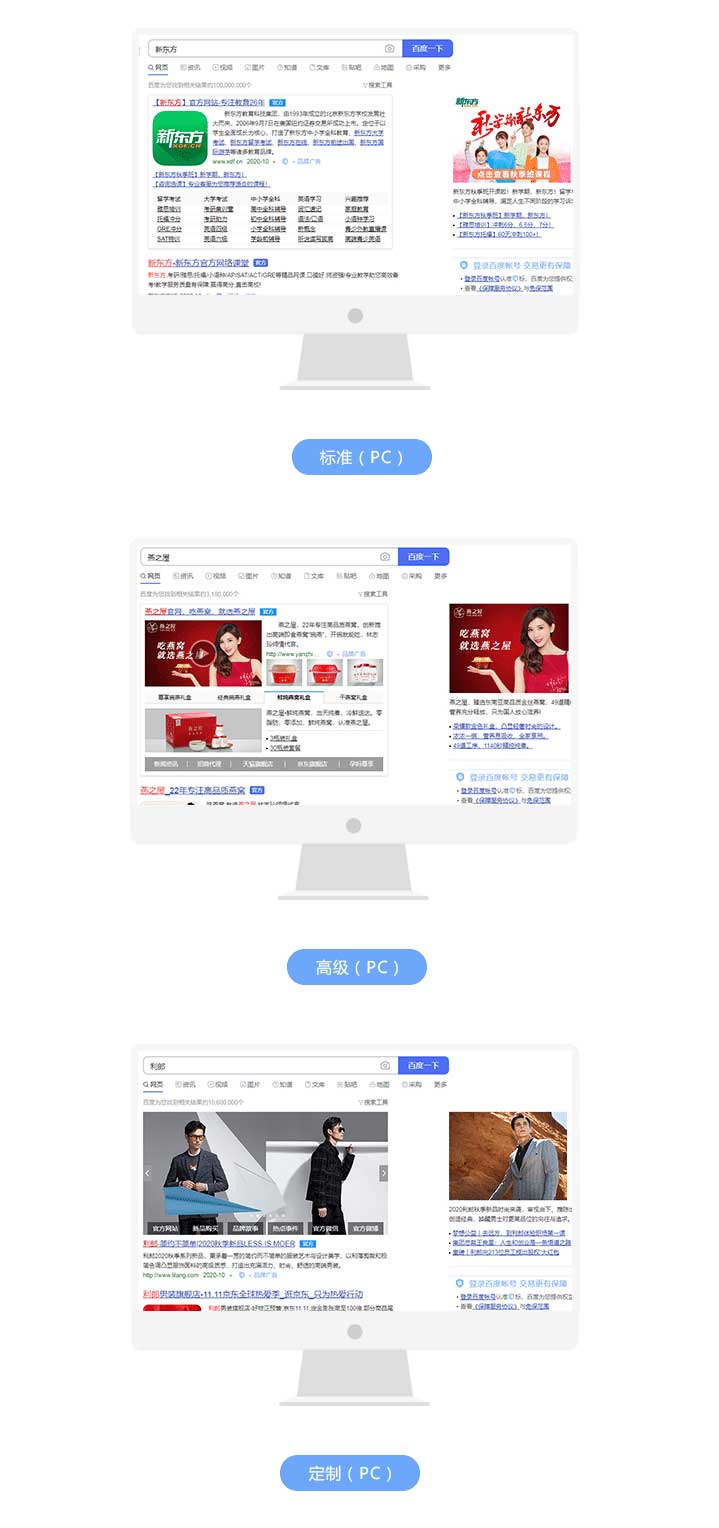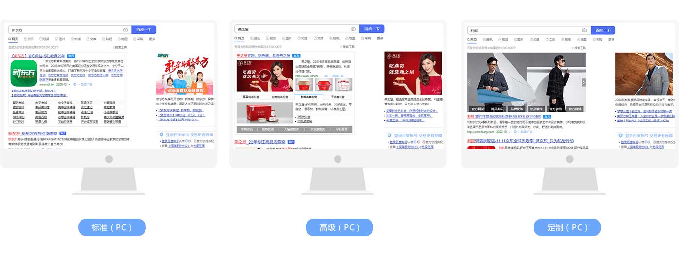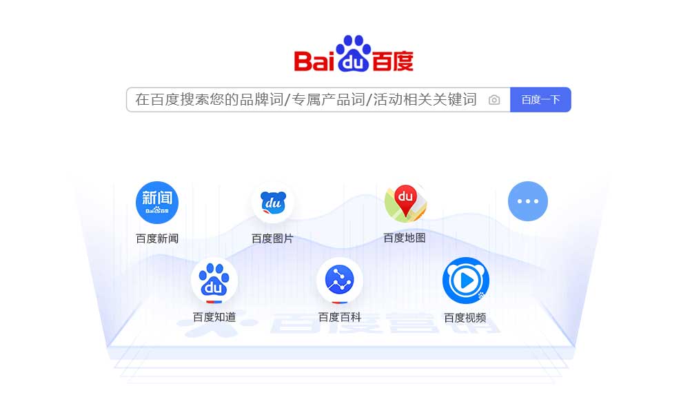 搜索結果首頁黃金位置,也可呈現在百度新聞、百度知道、百度百科、百度圖片、百度視頻、百度地圖等子頻道