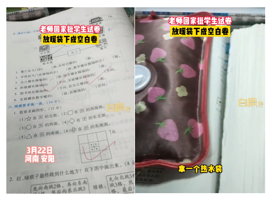 河南安陽的劉老師把沒改完的學生試卷拿回家批改,一不留神爸爸把暖水袋放試卷上,等她忙完再繼續批改時發現有十幾份卷子很多空白,一開始疑惑學生們為什么不好好答卷,最后才反應過來是用了可擦筆。